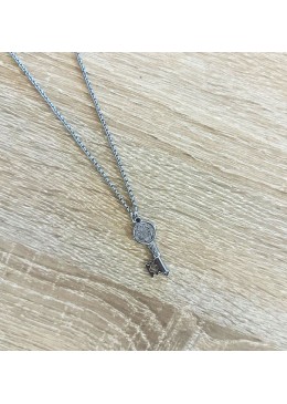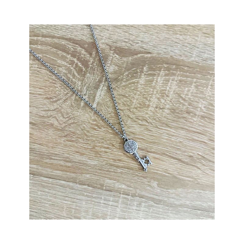 Collier pour Homme, chaîne en Acier Inoxydable et pendentif petite clef argentée 10x24mm double face: Croix et Saint Benoît.